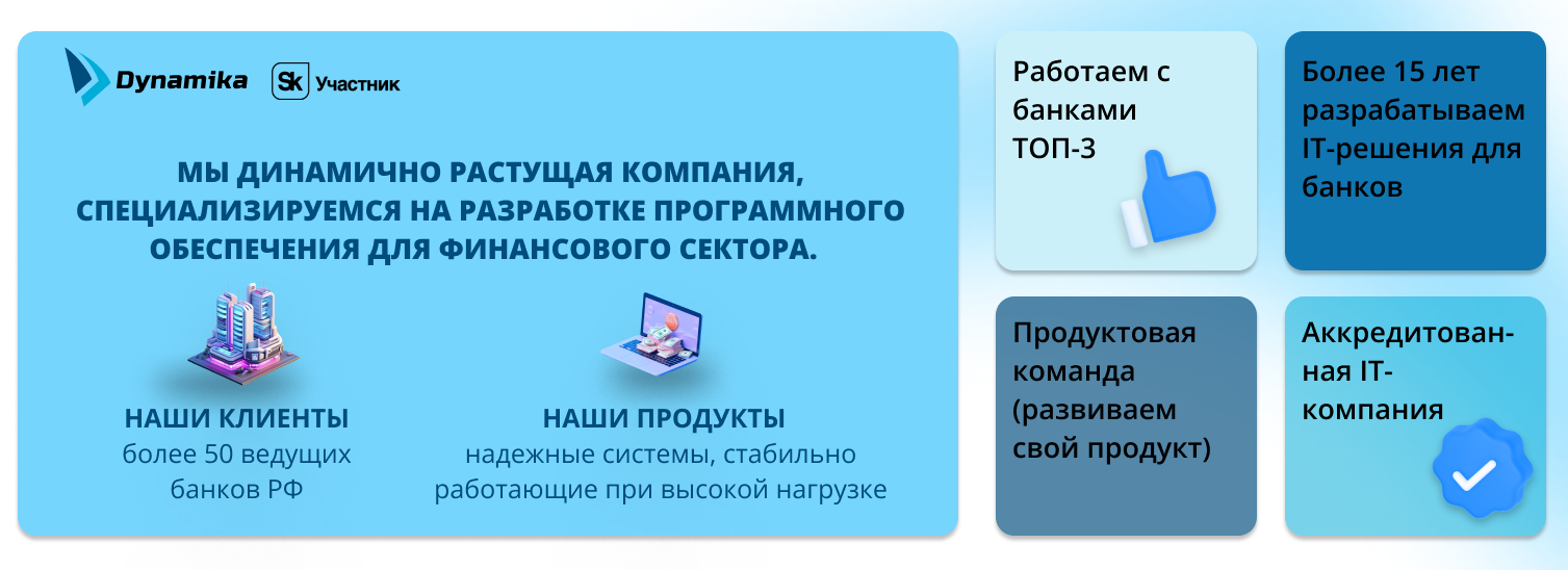 Компания «Динамика» - разработчик программного обеспечения для финансового сектора. Наши клиенты - более 50-ти ведущих банков РФ. Наши продукты — высокоинтеллектуальные, отказоустойчивые системы, обеспечивающие одновременную работу нескольких сотен пользователей.